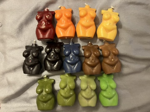 Handgjutet ljus av återbrukad stearin. Genomfärgat.